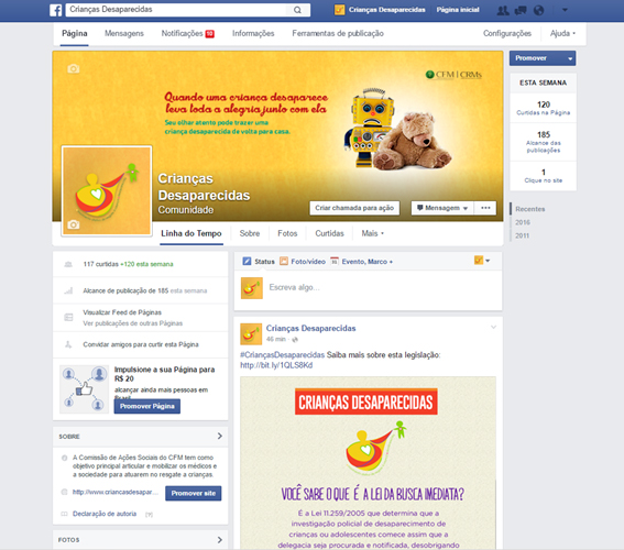 Cinquenta mil crianças e adolescentes desaparecem por ano no Brasil. Para reverter este número, o Conselho Federal de Medicina (CFM) lançou uma Fanpage no Facebook sobre a temática. A página eletrônica www.facebook.com/criancasdesaparecidascfm dá maior visibilidade para o tema e quer agregar uma rede de pessoas engajadas com questões sociais.